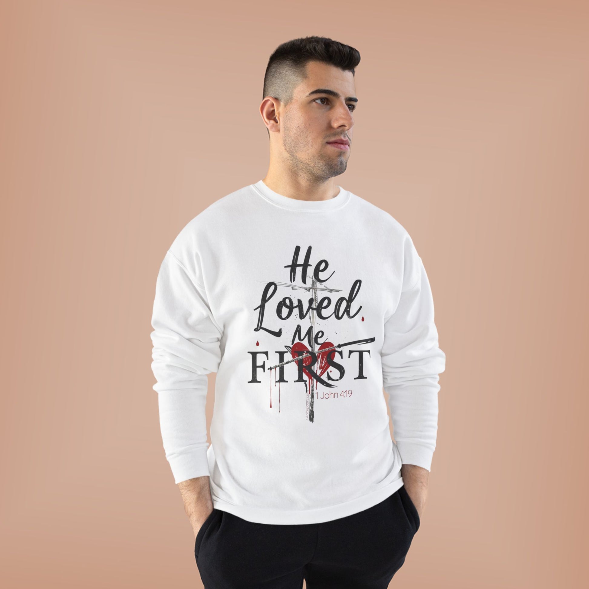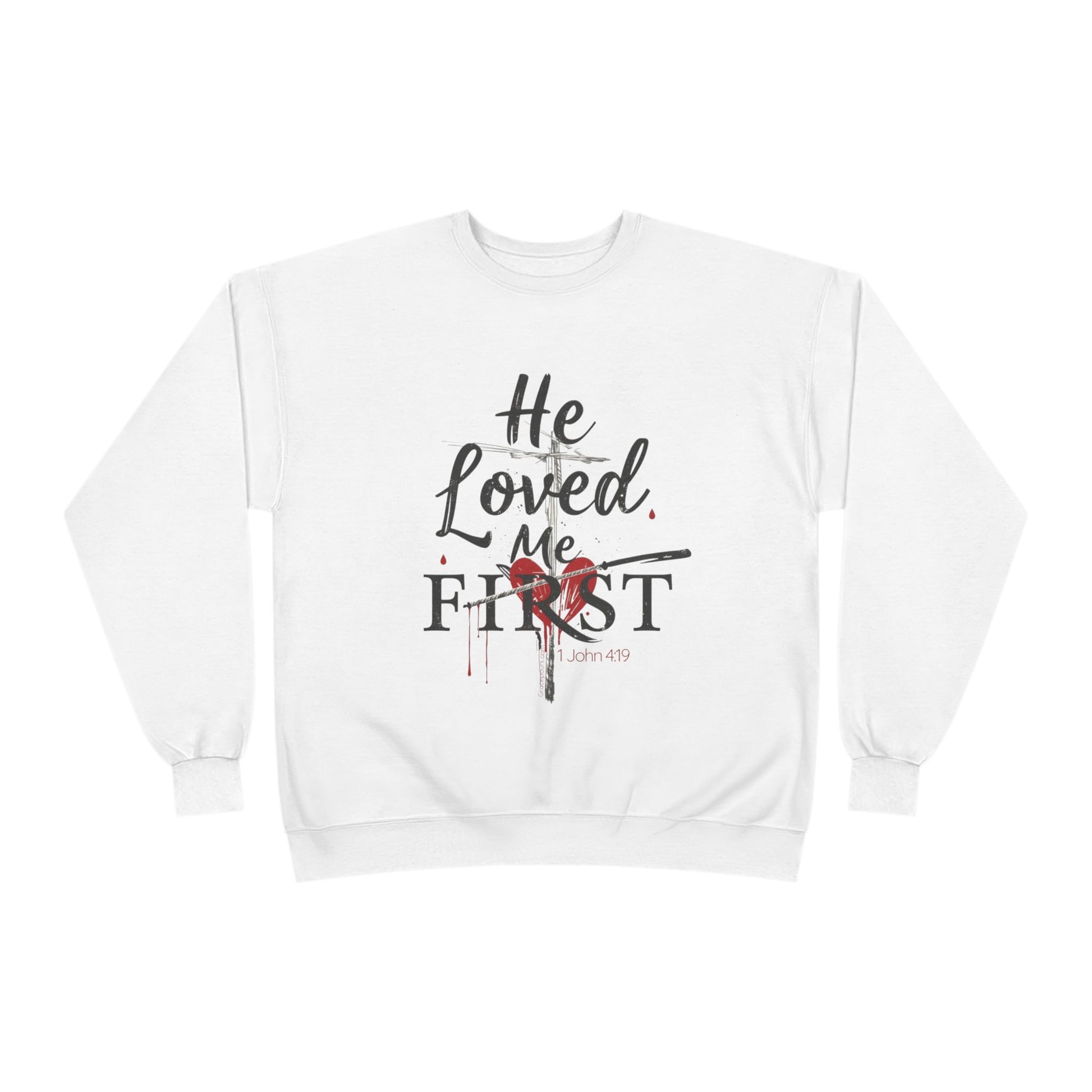 This cozy crewneck sweatshirt carries a quiet, faith-driven message: soft script reads “He Loved Me First” over a subtle heart-and-cross graphic.